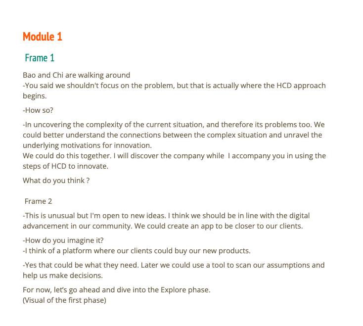 Mission: In co-creation with the local GIZ employees, we designed stories and visuals around the HCD course content. Selecting key tools for this introduction course was essential as the objective was to get users to want to learn more on HCD. The course content was inspired by IDEO (founders of the HCD approach) and Butterfly Works (International HCD practitioners for over 25 years). The course evolved along the story of Bao, an employee who gets introduced to HCD by a new intern. Behavioural change is inspired by the transformation of the main character along the storyline.